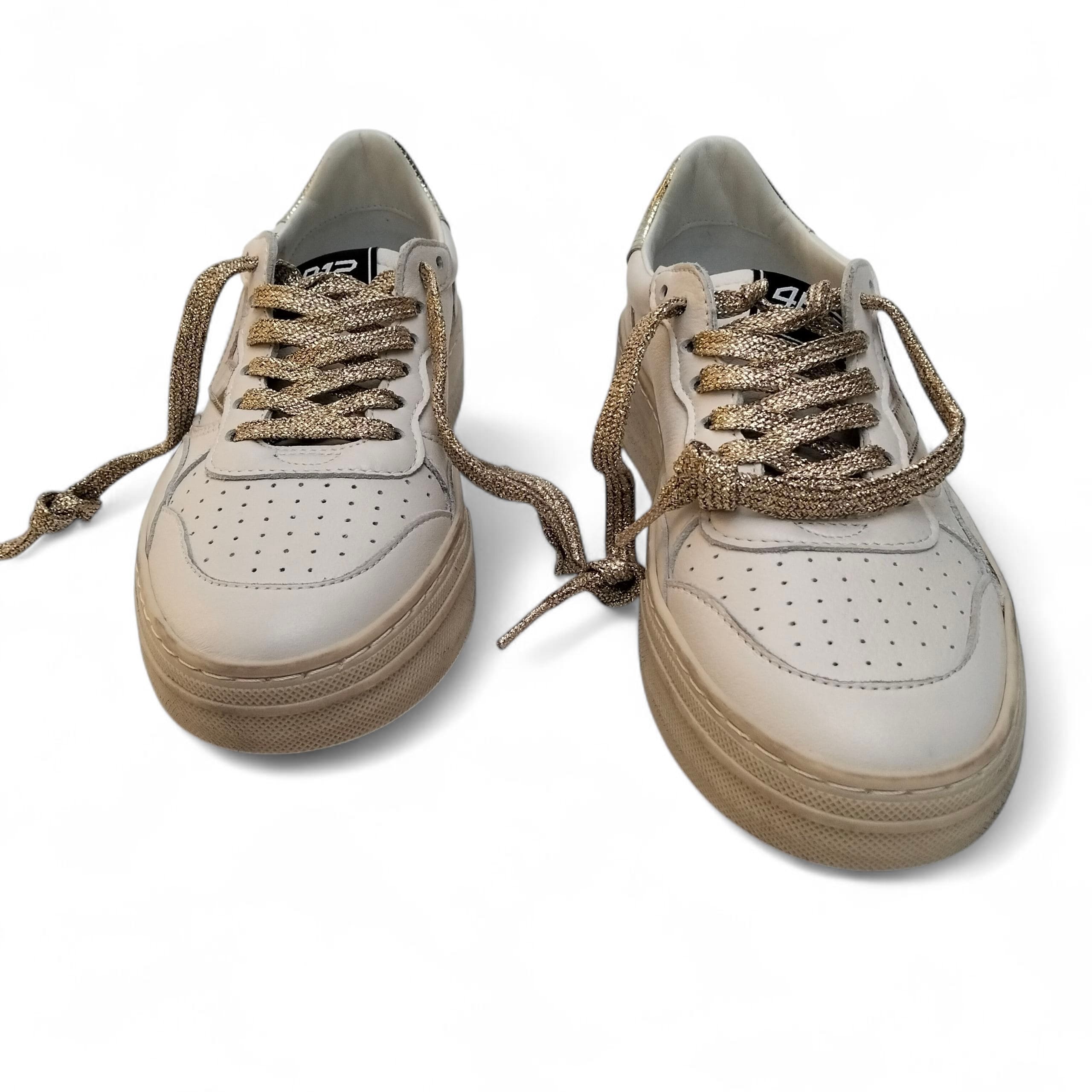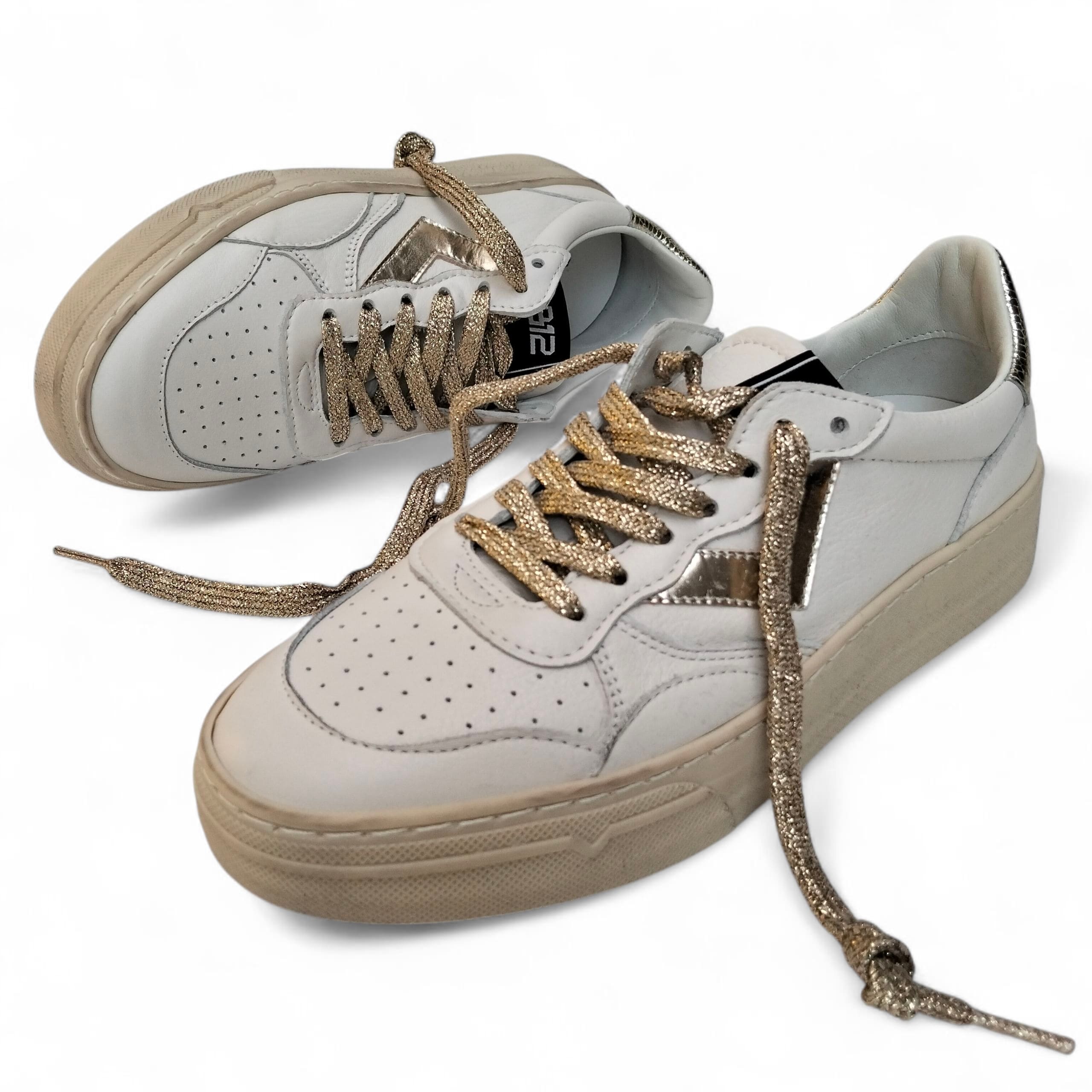 LA BASE IN PELLE BIANCA CREA UN LOOK PULITO, MENTRE IL TALLONE ORO EFFETTO VIPER E I LACCI GLITTERATI AGGIUNGONO QUEL GLOW CHE FA SUBITO SCENA.