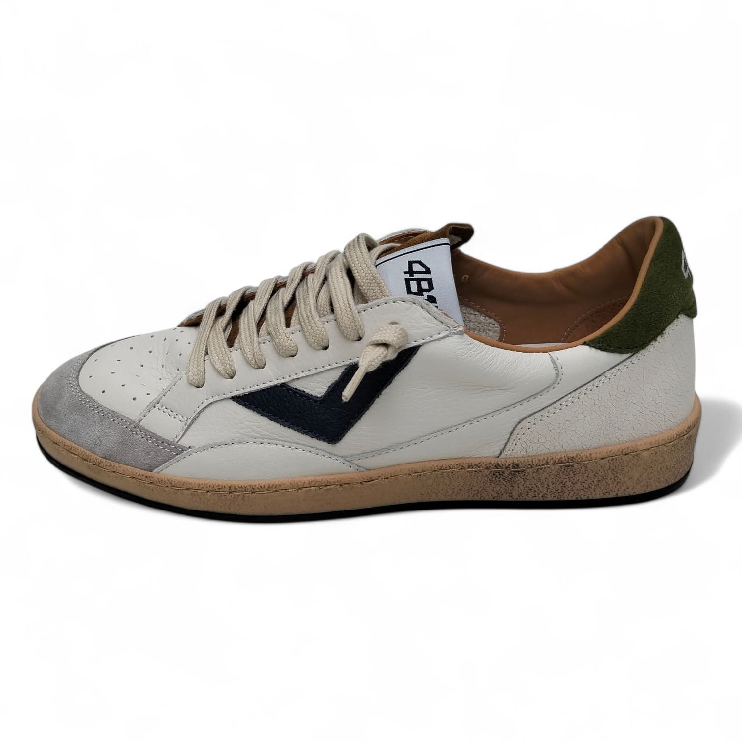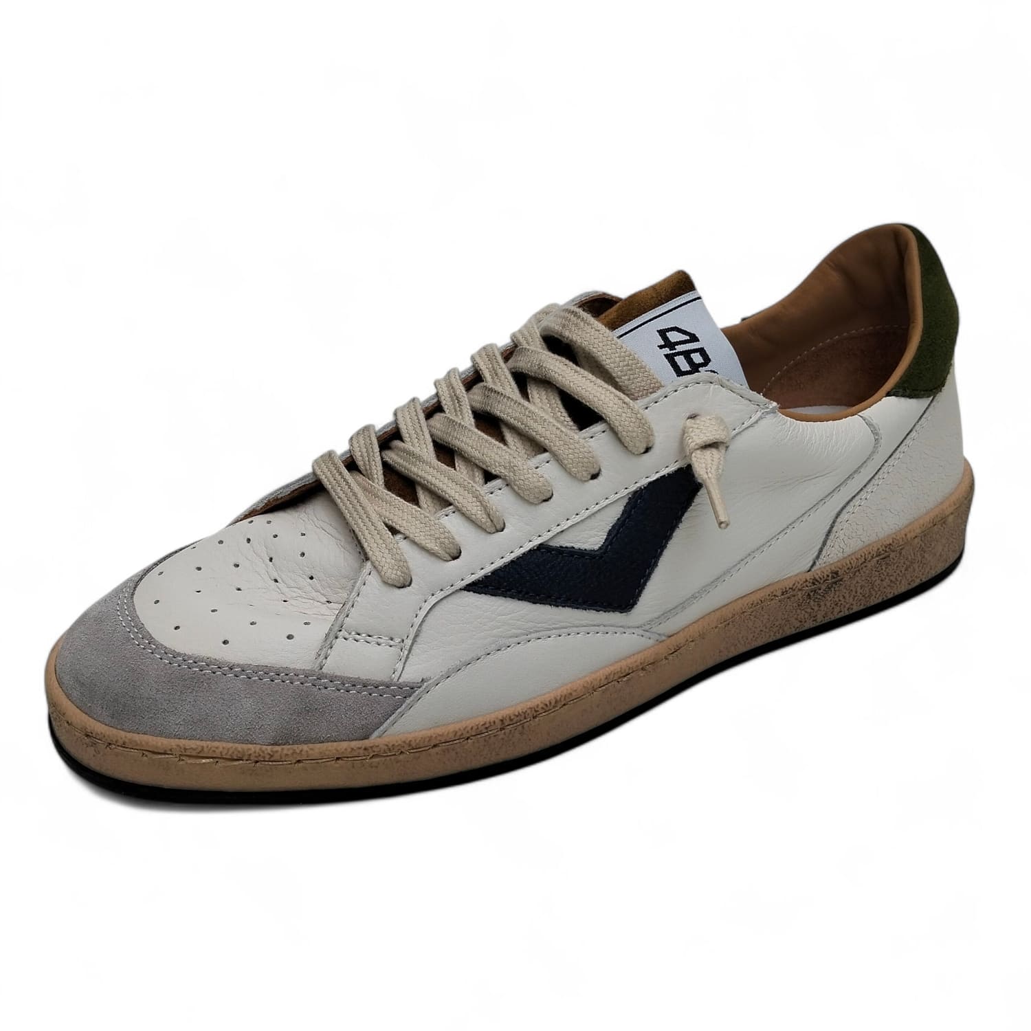 LA BASE IN PELLE BIANCA E’ ARRICCHITA DA UNA FRECCIA LATERALE BLU SCURO E UN TALLONE VERDE A CONTRASTO CHE AGGIUNGONO PERSONALITA’ SENZA APPESANTIRE IL LOOK.