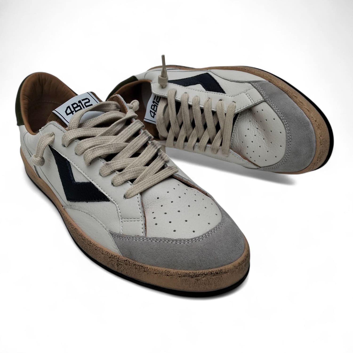 LA SUOLA BEIGE EFFETTO VINTAGE MANTIENE QUEL VIBE OLD-SCHOOL SEMPRE ATTUALE, MENTRE I LACCI CHIARI RENDONO TUTTO SUPER PULITO.